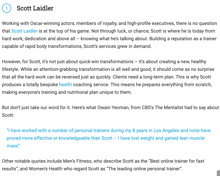 “Scott Laidler is a highly respected exercise professional with a diverse and varied skillset. With over 10 years’ experience in the sector, he wears many hats, including but not limited to celebrity personal trainer, corporate wellness consultant, fitness writer, and online personal trainer”